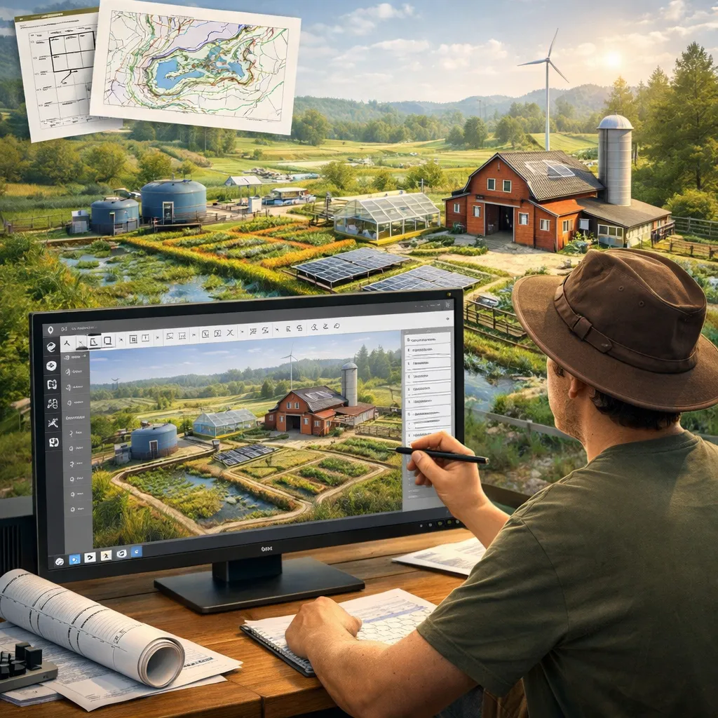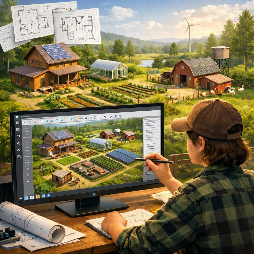 Start with a home. Add an energy system. Add a farm. Add a workshop. Design a full 30-acre development node — all in one platform.