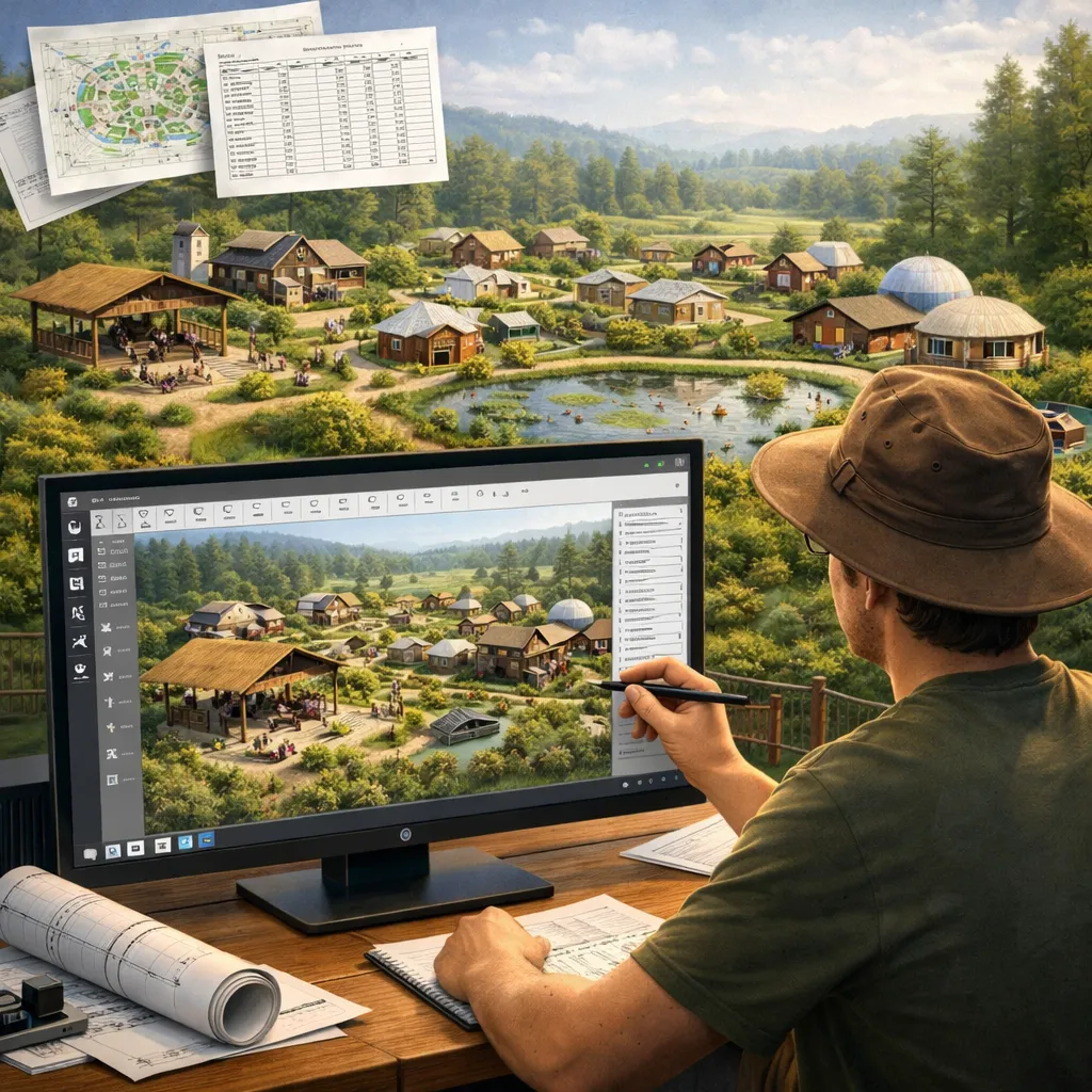 You're starting or growing an intentional community, ecovillage, or rural development. Design a complete, functioning settlement for dozens of people using one platform.